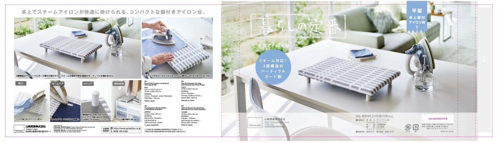 卓上でスチームアイロンが快適に掛けられる、すべらない脚付きアイロン台。3層構造のパーティクルボード製の天板だから、スチームの蒸気や熱を透過せず、テーブルを傷めません。ファブリックボードのようなアイロン台。キャップは接地面が丸いため、がたつかずシリコーンで滑りません。衣類をアイロン台の下に滑り込ませられるので、立体的にアイロン掛けができます。ネームタグや、アップリケの接着に。
