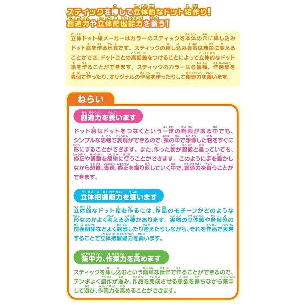 「立体ドット絵メーカー」は、長さの異なる2種類のスティックを使い、高低差をつけながら立体的なドット絵を作成する創作玩具です。