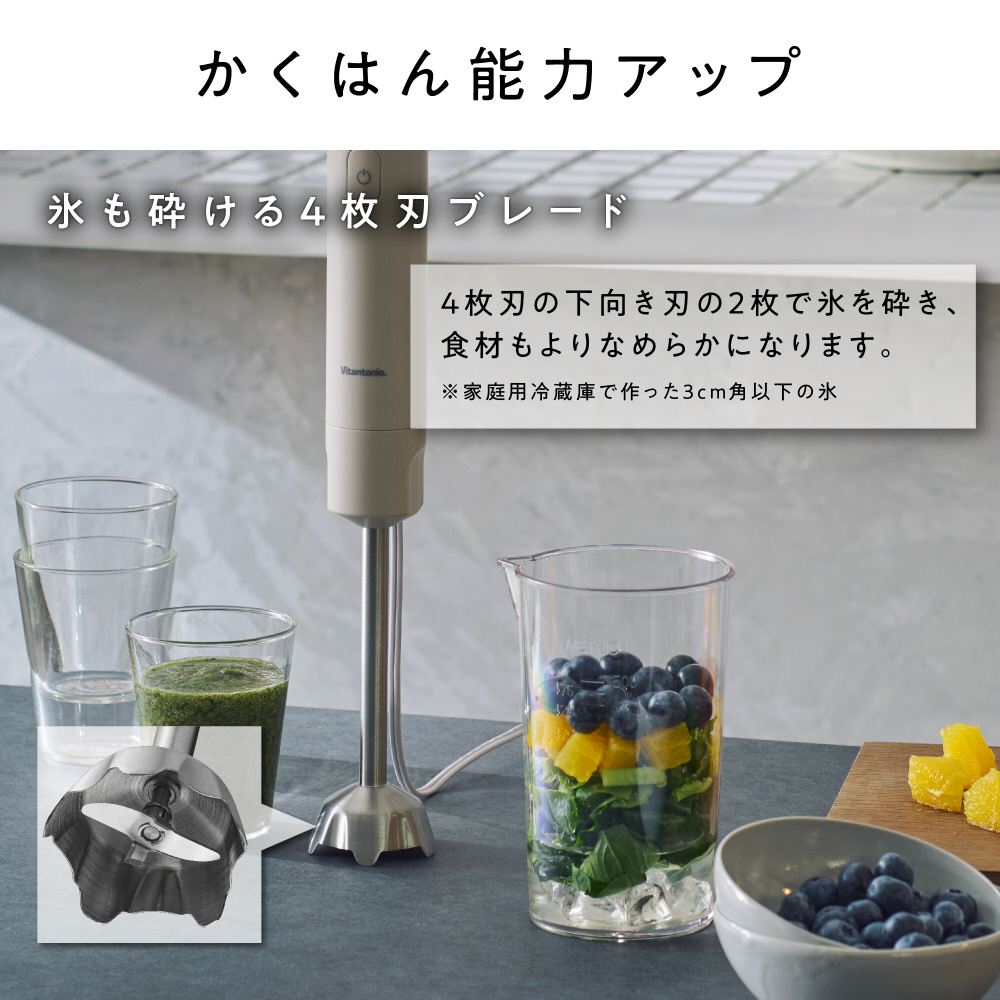 ブレンダー機能時は4枚刃なので氷も砕いて、ひんやりスムージーが作れます
