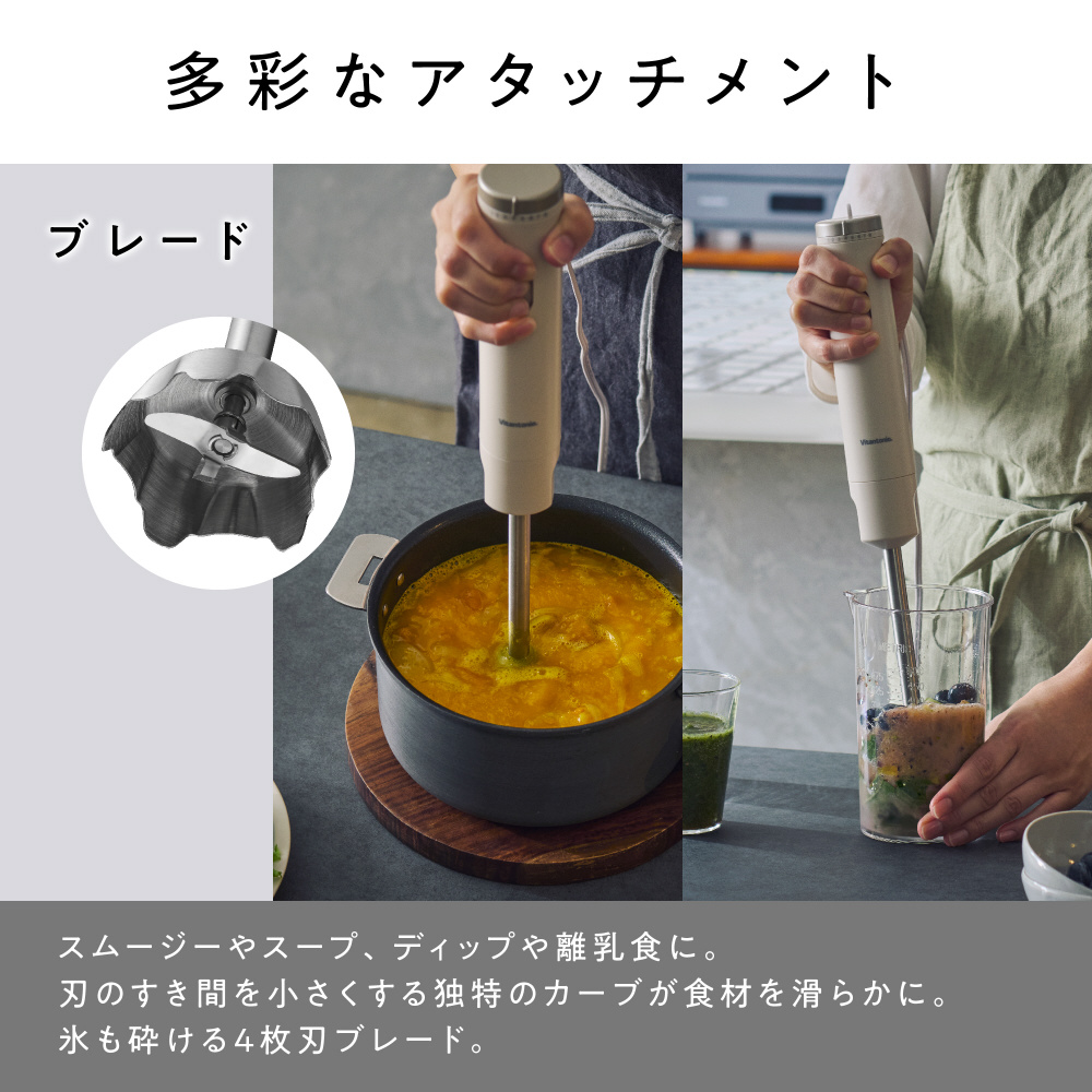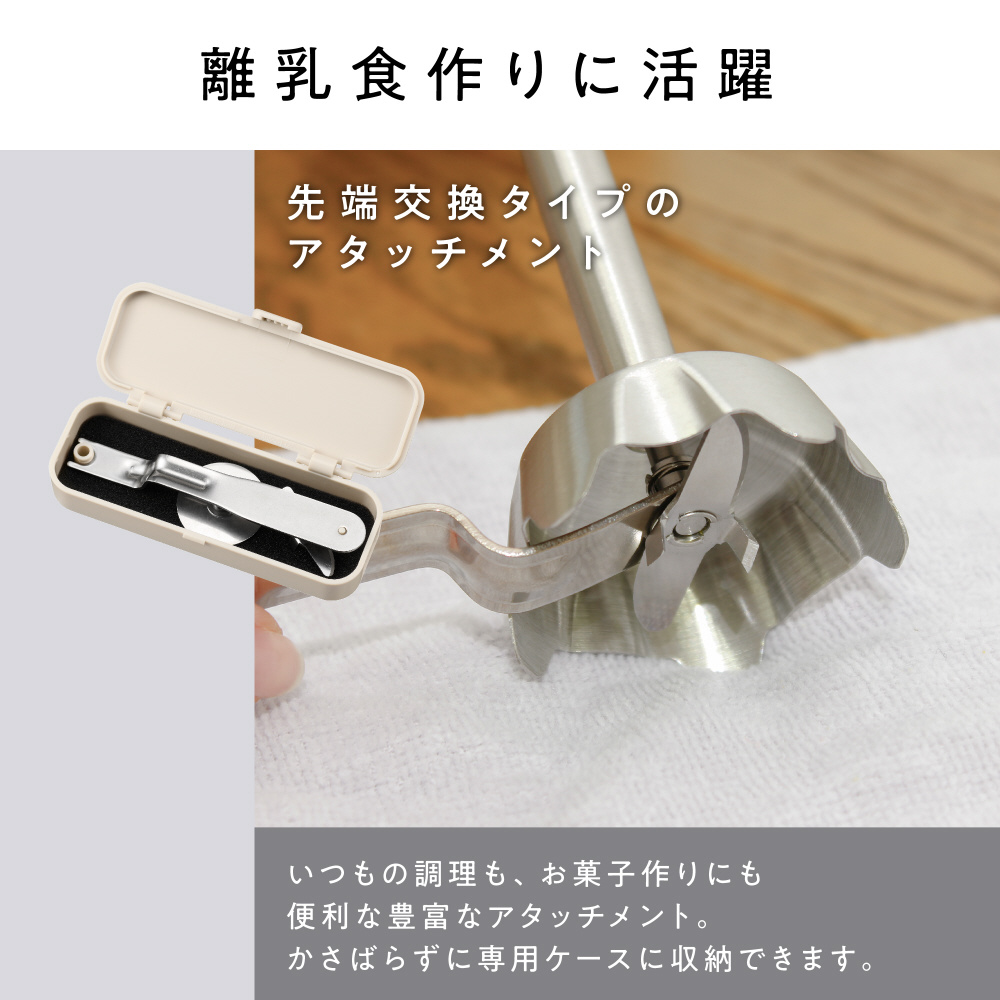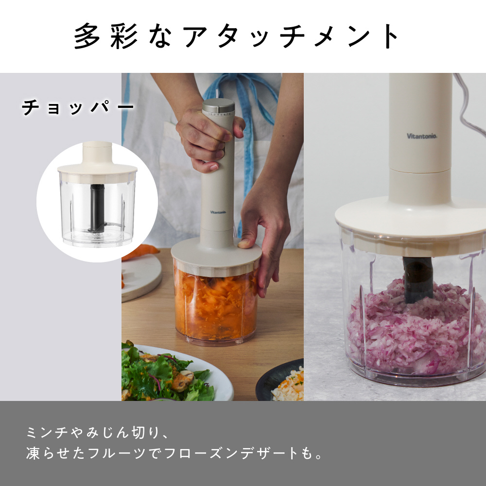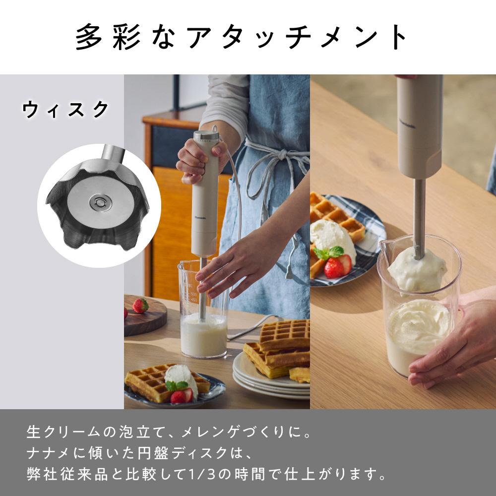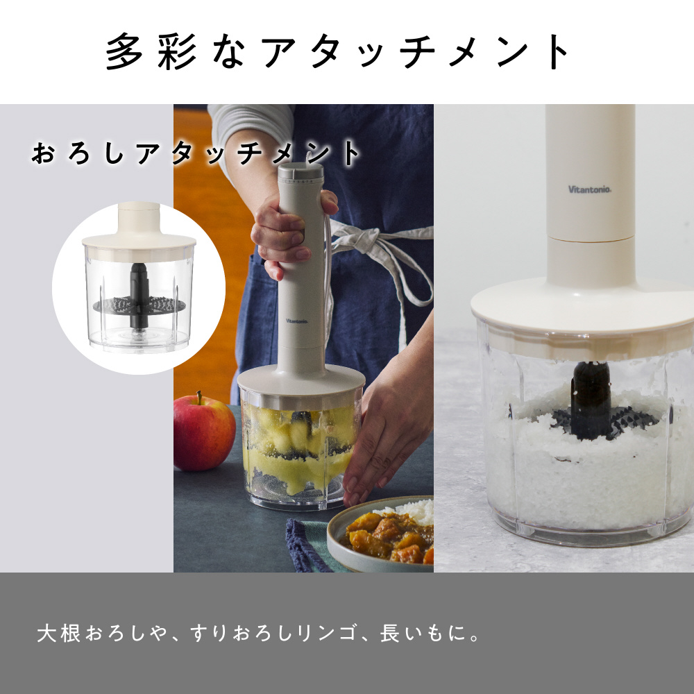 ブレンダーだけでなく、おろしやホイップの泡立て、みじん切りもできる豊富なアタッチメント