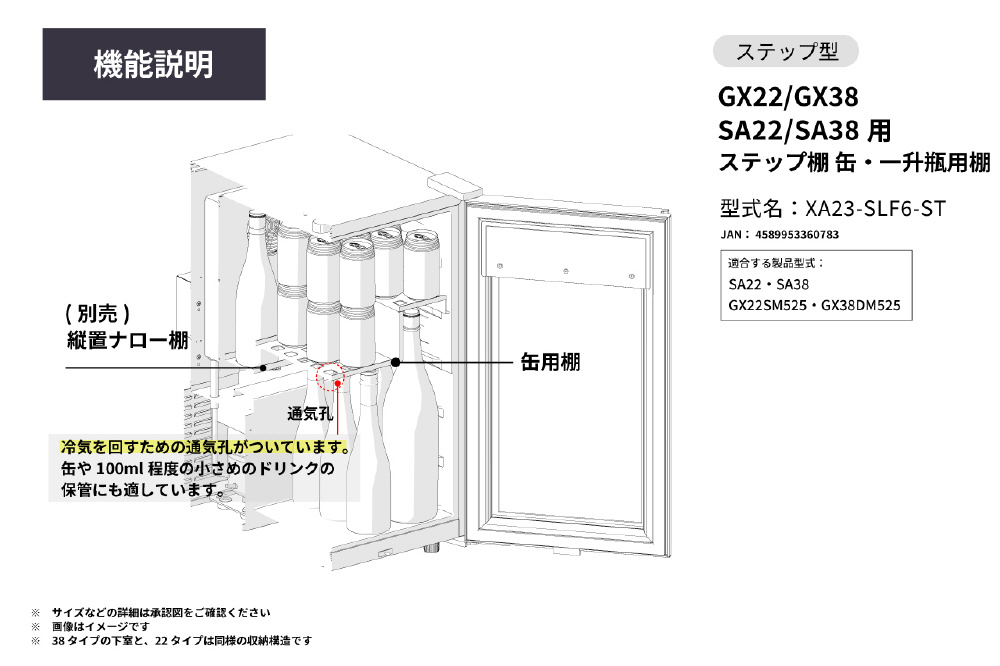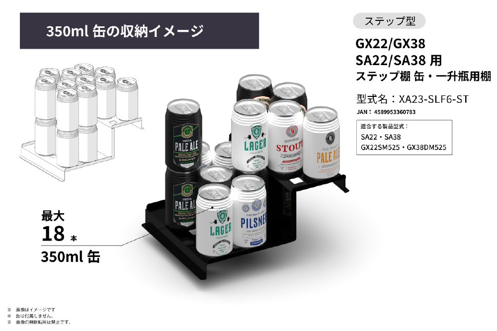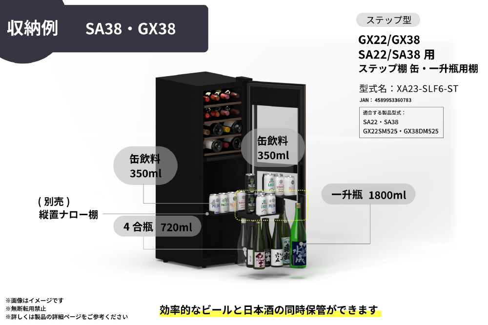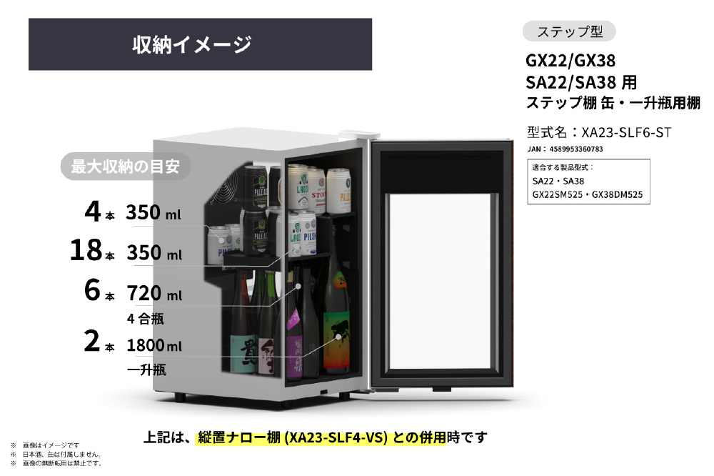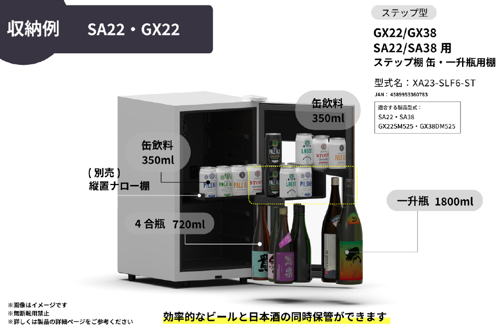 日本酒一升瓶・四合瓶・缶飲料 様々な形状の飲料を同時に保管されたい方へおすすめのオプション部品です。