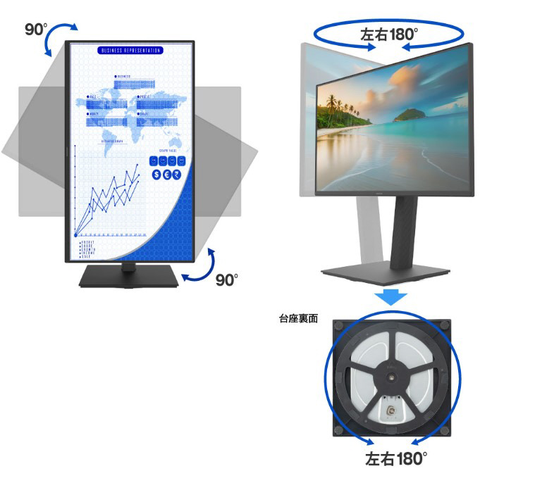 「左右90°回転ピボット」、「最大130mmの高さ調節」、「-7°〜+30°のチルト調整」、「左右180°のスイベル(台座回転)」が可能な多機能スタンドを付属しているため、最適な姿勢になるよう調整することで目や肩にかかる負担を抑え長時間の利用でも快適にご利用いただけます。