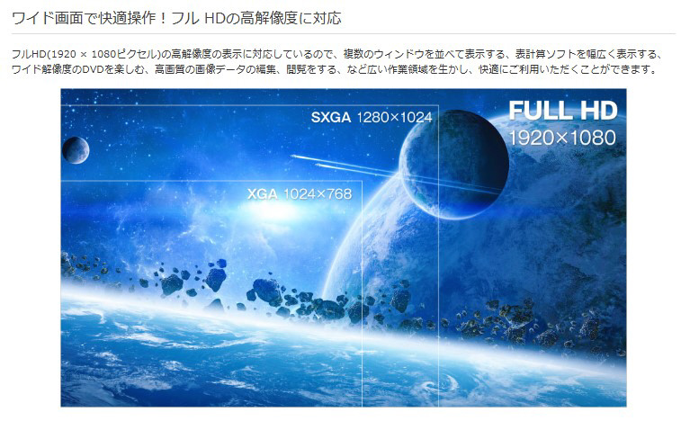 フルHD(1920×1080ピクセル)の高解像度の表示に対応しているので、複数のウィンドウを並べて表示する、表計算ソフトを幅広く表示する、ワイド解像度のDVDを楽しむ、高画質の画像データの編集、閲覧をする、など広い作業領域を生かし、快適にご利用いただくことができます。