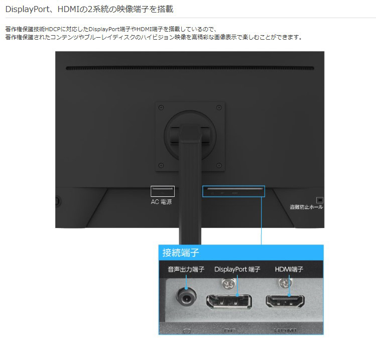 著作権保護技術HDCPに対応したDisplayPort端子やHDMI端子を搭載しているので、著作権保護されたコンテンツやブルーレイディスクのハイビジョン映像を高精彩な画像表示で楽しむことができます。