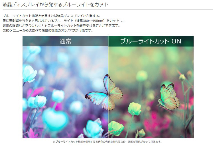 ブルーライトカット機能を使用すれば液晶ディスプレイから発する、眼に悪影響を与えると言われているブルーライト(波長380〜495nm)をカットし、専用の眼鏡などを掛けなくともブルーライトカット効果を受けることができます。OSDメニューからの操作で簡単に機能のオン/オフが可能です。