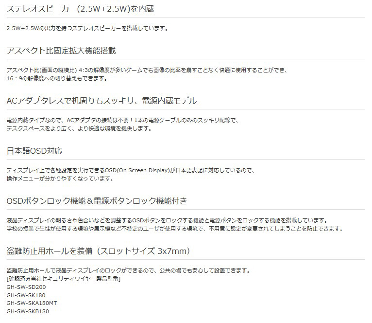 液晶ディスプレイの明るさや色合いなどを調整するOSDボタンをロックする機能と電源ボタンをロックする機能を搭載しています。学校の授業で生徒が使用する環境や展示機など不特定のユーザが使用する環境で、不用意に設定が変更されてしまうことを防止できます。