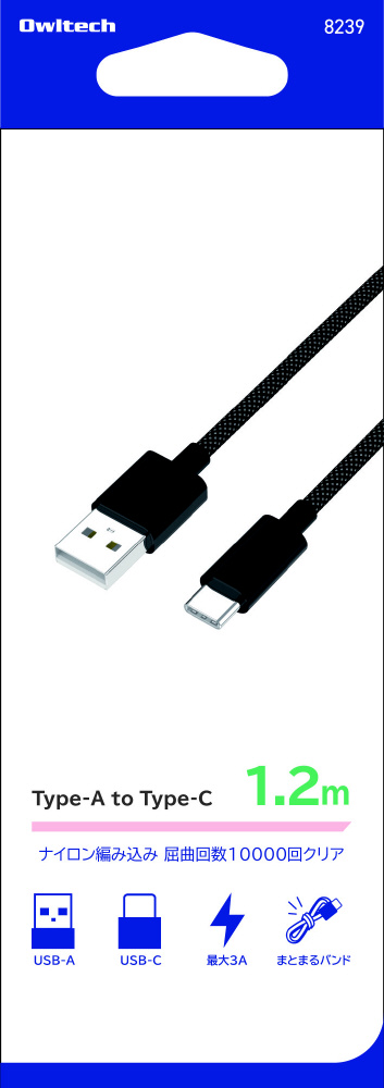 ブレイデッドケーブル Type-A to C 1.2m ブラック OWL-CBN1AC12-BK [USB-A ⇔ USB-C]