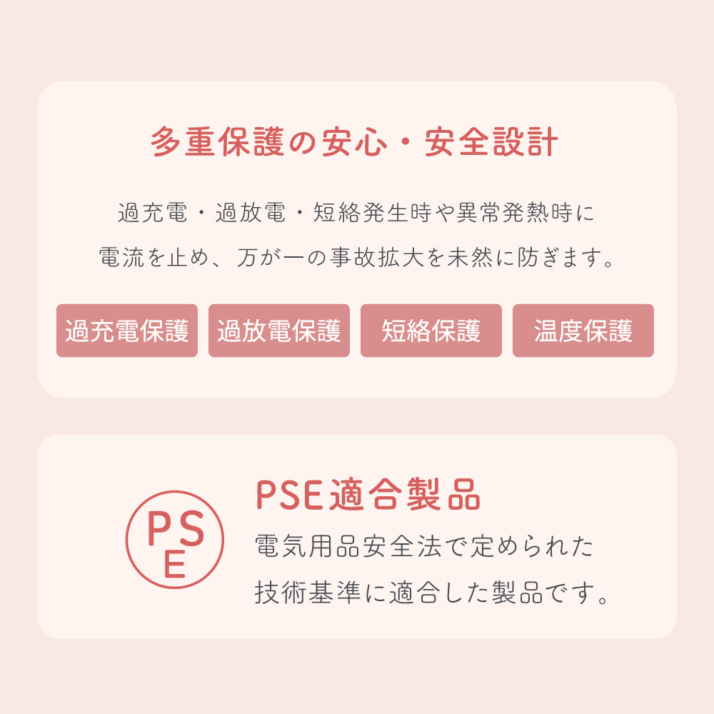 保護機能の「過充電(電圧/電流)保護」「過放電(電圧/電流)保護」「短絡(ショート)保護」「温度保護」を搭載し、高い安全性を備えております。