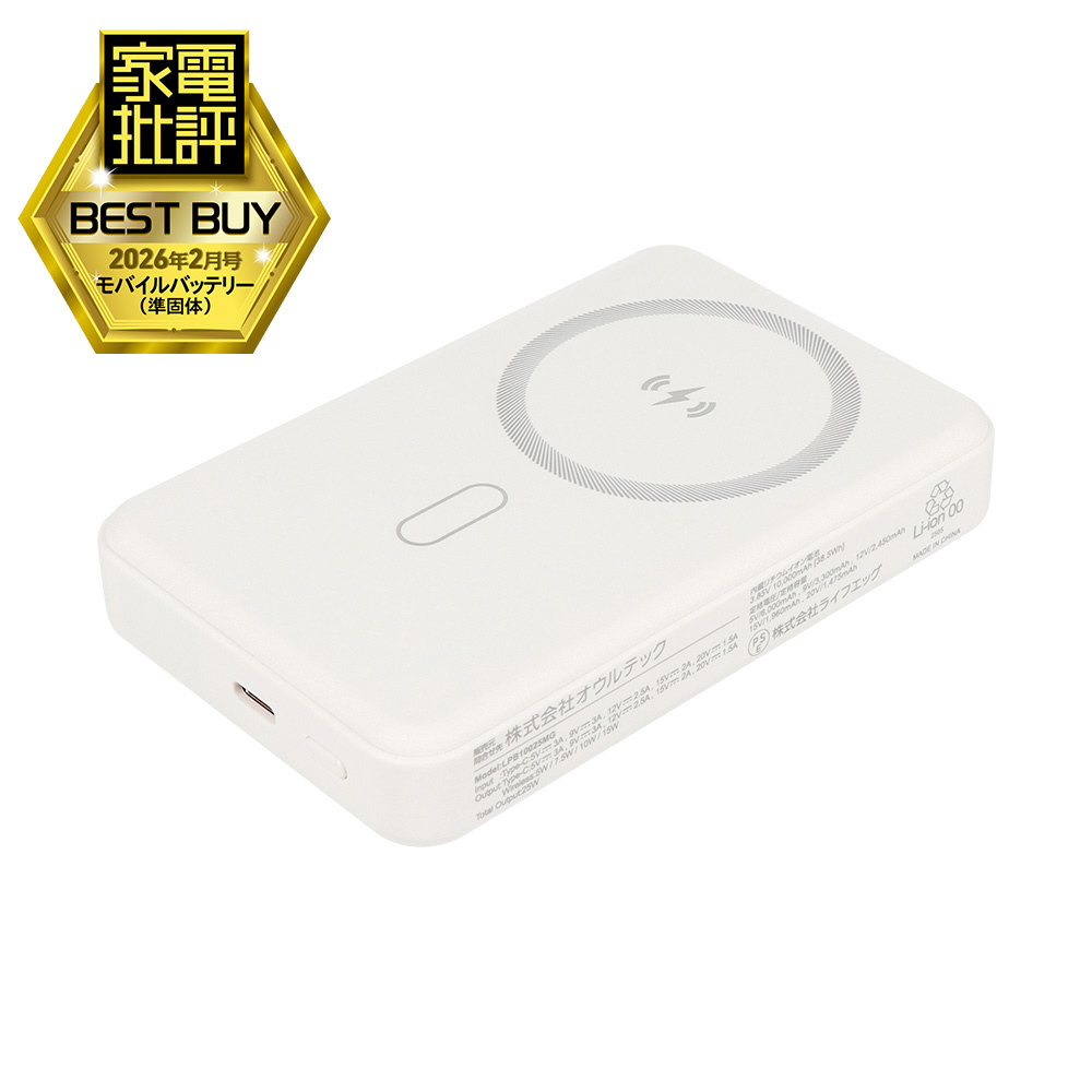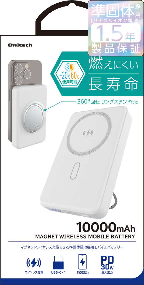 モバイルバッテリー 10000mAh 準固体電池採用 マグネット式ワイヤレス充電 スマホリング搭載 最大PD20W USB Type-C入出力 ホワイト OWL-LPB10025MG-WH [USB Power Delivery対応 /1ポート]