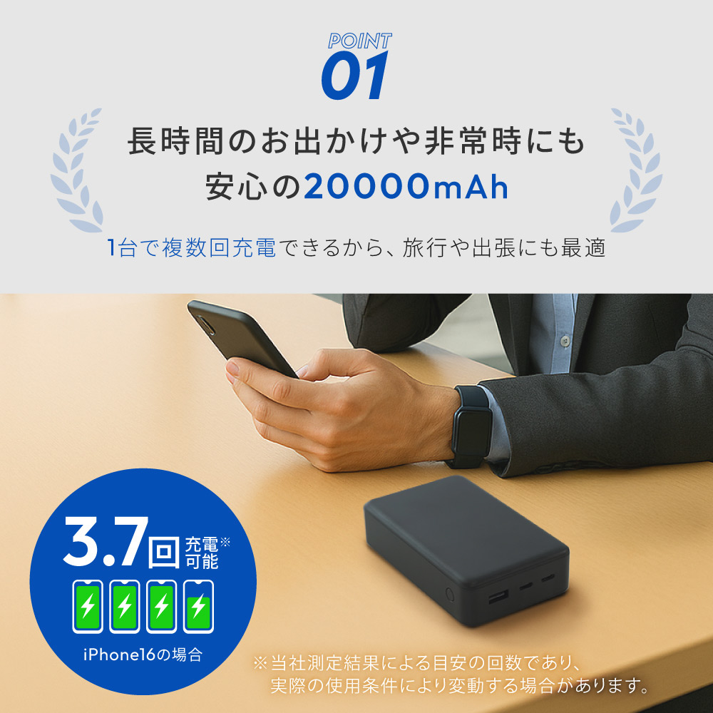 ※2025年9月時点、弊社発売の容量20000mAhのモバイルバッテリーとの比較。