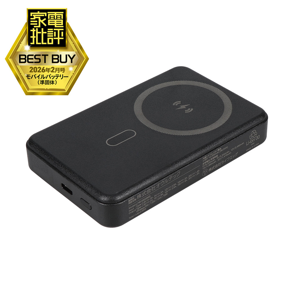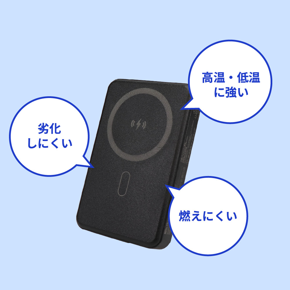 安全性に優れる「準固体電池」を採用した、容量10000mAhのワイヤレス充電対応モバイルバッテリーです。