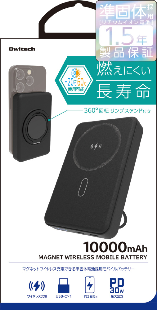 モバイルバッテリー 10000mAh 準固体電池採用 マグネット式ワイヤレス充電 スマホリング搭載 最大PD20W USB Type-C入出力 ブラック OWL-LPB10025MG-BK [USB Power Delivery対応 /1ポート]