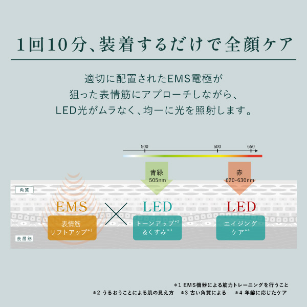 *1 引き上げるようにマスクを装着した状態。*2 うるおうことによる肌の見え方*3 特開2025−026712 メラニン産生抑制装置及びメラニン産生抑制方法*4 電気刺激を筋肉に伝え、筋肉を動かすこと*5 EMS波形による感じ方