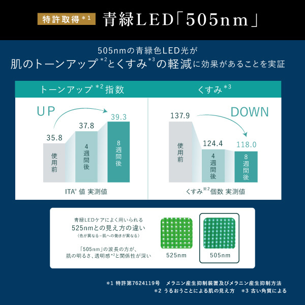 肌の明るさ、透明感*2を導く、特許取得の*3505nm青緑光を搭載