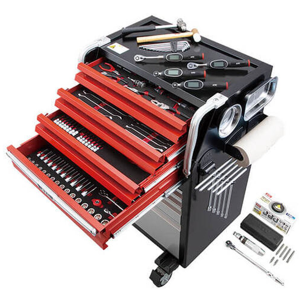 作業者の動きを研究し作業効率と安全性を追求した、次世代型ローラーキャビネット「EKX-118」に充実したアイテムを入組んだツールセットです。