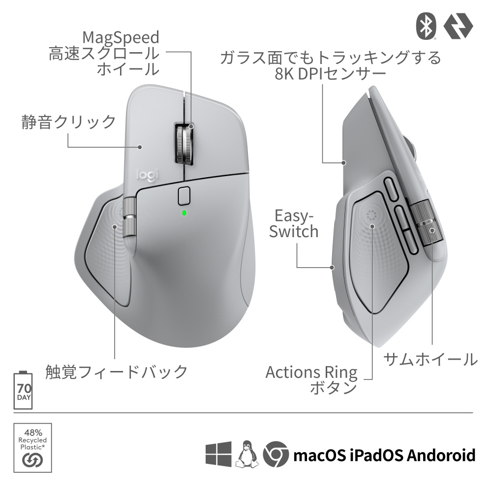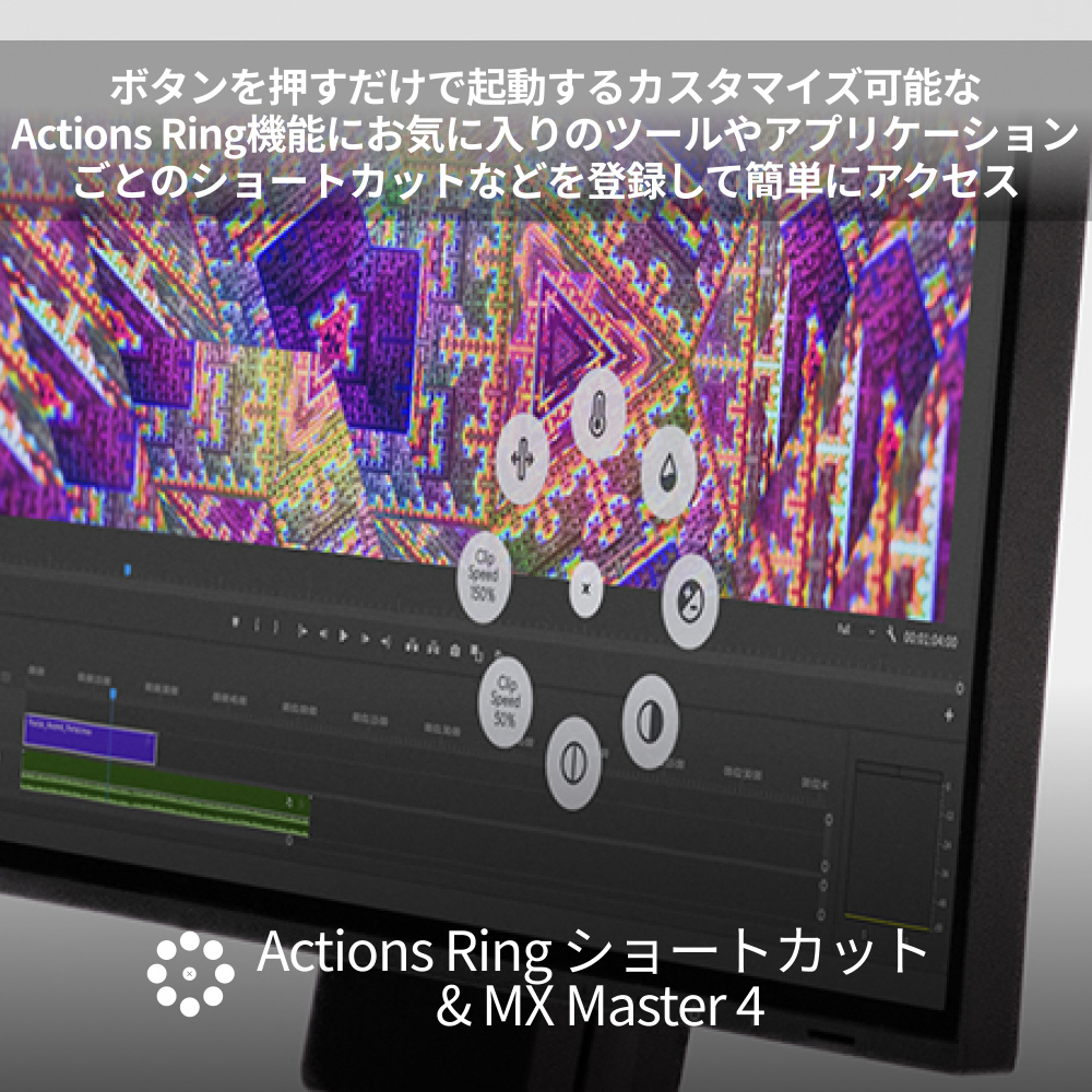 親指エリアに「触覚フィードバック センスパネル」が新たに追加されています。このパネルを押すことで8つのショートカットがリング状に表示され、カーソルを合わせるだけで瞬時に実行できる「Logi Options+」の新機能「Actions Ring」に対応しています。「Actions Ring」により、日常的に使用するAIツールへのアクセスやデバイスの切り替えが瞬時に実行でき、生産性のさらなる向上に寄与します。また、ロジクール製品のマウスとして初となる、動作・ショートカット・通知に応じて親指エリアが細やかに振動する触覚フィードバック機能を搭載し、直感的な操作を実現します。「MX MASTER 4」は、ソフトウェアとハードウェア双方の進化により、ユーザーの創造性と生産性を次のレベルへと引き上げます。