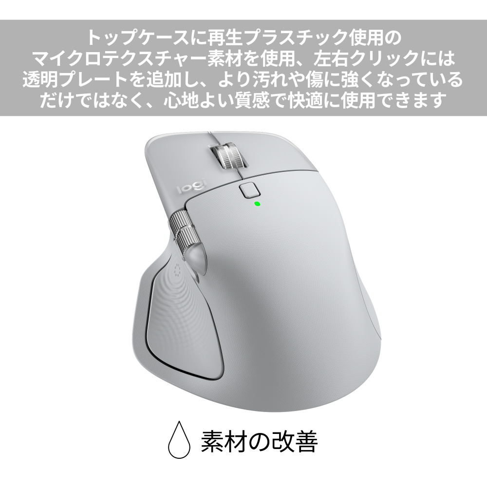 本体は、汚れや傷に強い素材を採用しており、左右クリックには汚れや摩耗を防ぐ透明プレートを採用し、毎日マウスを使用するユーザーでもきれいな状態を長く保ちながらお使いいただけます。また、表面に微細なパターンを施したマイクロテクスチャーを施しているため、心地よい質感で快適に使用できます。