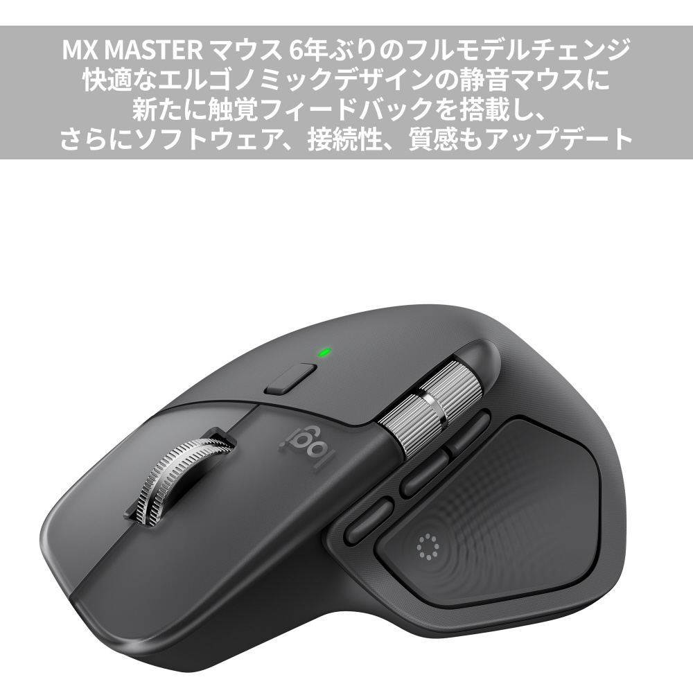 親指エリアに「触覚フィードバック センスパネル」が新たに追加されています。このパネルを押すことで8つのショートカットがリング状に表示され、カーソルを合わせるだけで瞬時に実行できる「Logi Options+」の新機能「Actions Ring」に対応しています。「Actions Ring」により、日常的に使用するAIツールへのアクセスやデバイスの切り替えが瞬時に実行でき、生産性のさらなる向上に寄与します。また、ロジクール製品のマウスとして初となる、動作・ショートカット・通知に応じて親指エリアが細やかに振動する触覚フィードバック機能を搭載し、直感的な操作を実現します。「MX MASTER 4」は、ソフトウェアとハードウェア双方の進化により、ユーザーの創造性と生産性を次のレベルへと引き上げます。