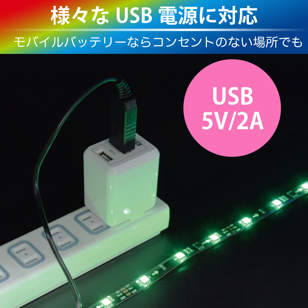 テープLEDの電源は、5V/2A出力に対応したUSB電源をご利用いただけます。