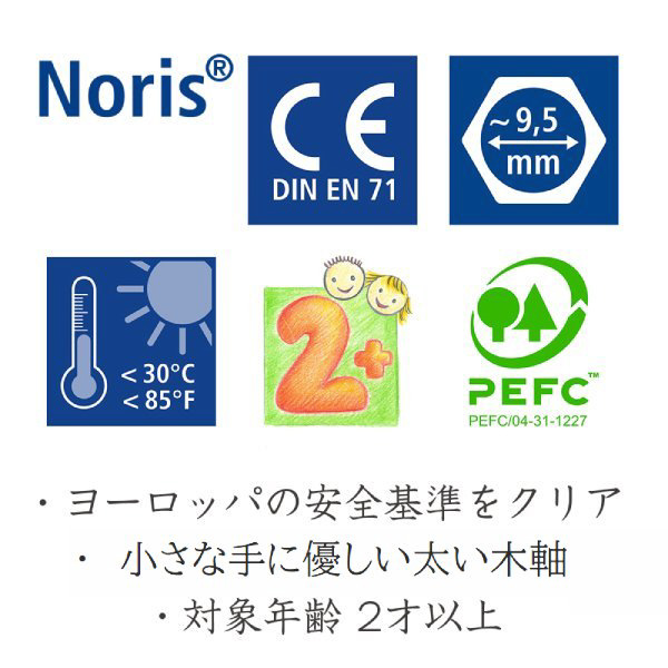 2歳から使える筆記具シリーズ「ノリス ジュニア」 六角形の太軸で小さなお子様でも持ちやすい、力をいれなくてもすいすい描けるなめらかな描き心地の色鉛筆です。水でなぞれば水彩画のように、色えんぴつ・クレヨン・水彩色えんぴつの3種類の楽しみ方ができます。テーブルやフローリングにはみ出した時には、水拭きで落とせます。