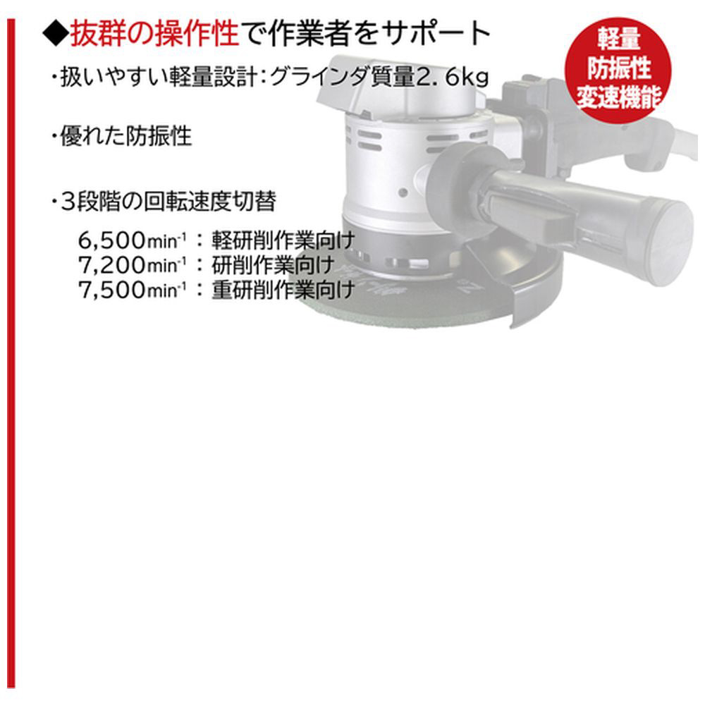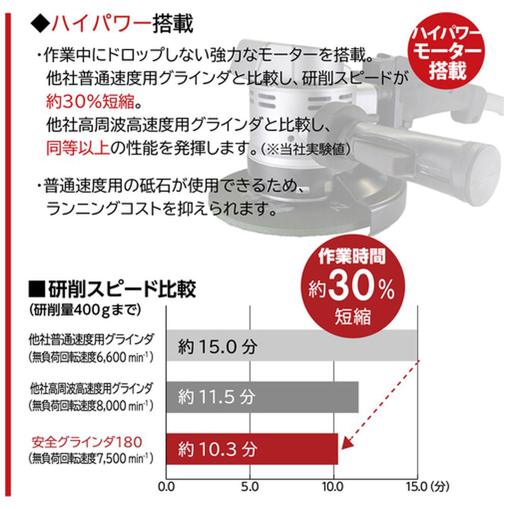 ■ハイパワーモーター搭載により、他社普通速度用グラインダと比較し、研削スピードが約30%短縮します。
