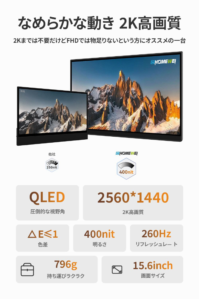QLED 15.6インチ 2K 薄型 USB-C接続 PCモニター リフレッシュレート260Hz