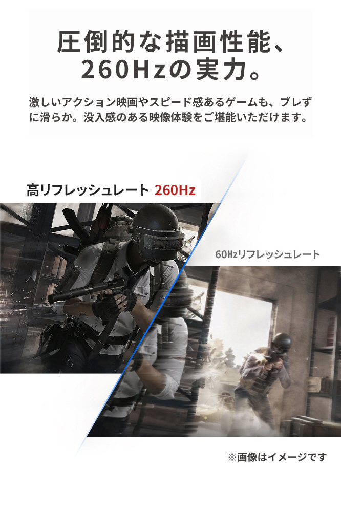 リフレッシュレートは260Hz(応答速度は1ms)のため、FPS・TPS等のゲームやアクション映画等の動きが激しい映像に特化した商品です。