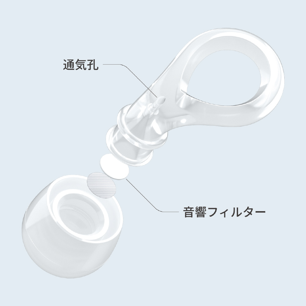 音響工学の原理に基づいて緻密に設計された空間と通気孔、抑制する帯域をコントロールする音響フィルターによって、耳に届く音声や雑音を全帯域でバランスよく軽減することができます。