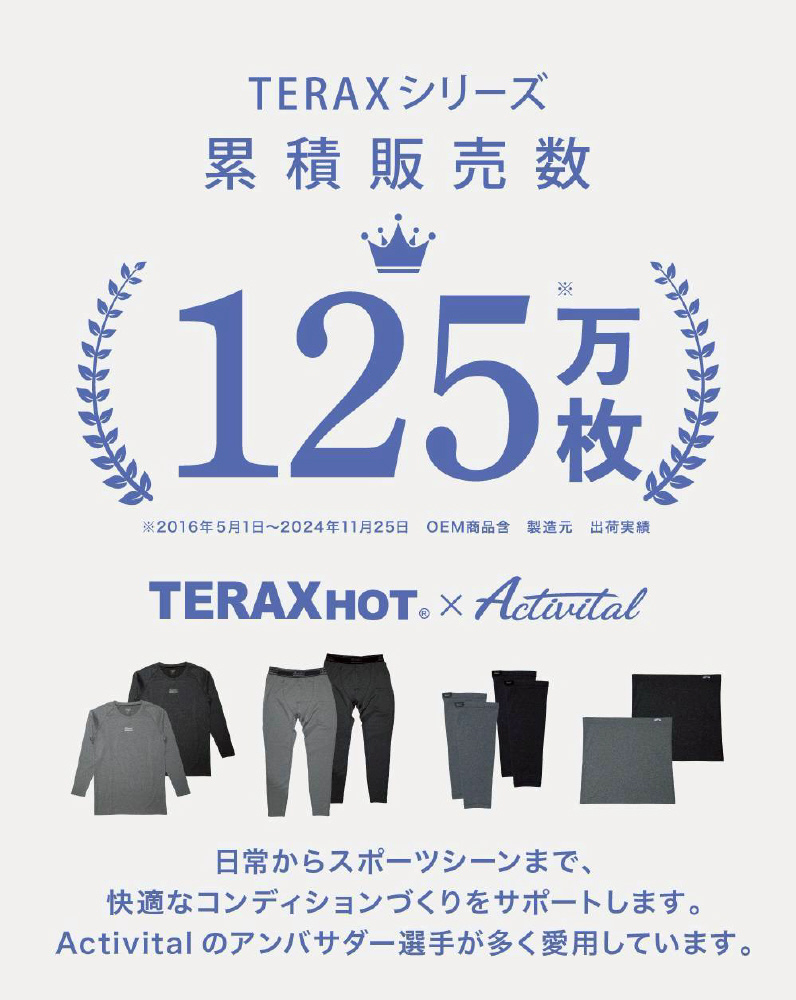熱伝導率が高く、医療やバイオ、美容健康にまで応用されるテラヘルツ鉱石を粉体にし、生地にプリントすることで血行を促進できる機能性のインナーです。
