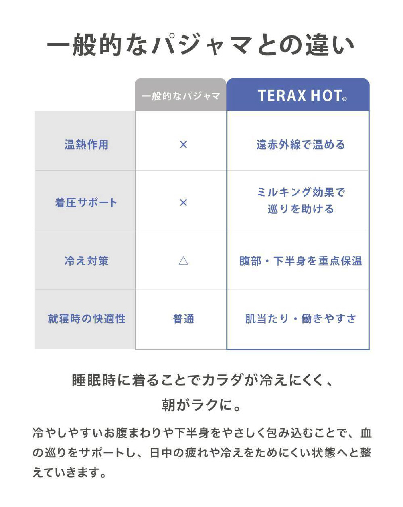 生地に施した特殊なテラヘルツ鉱石などのプリントが人体から放出される体温エネルギーを受け取って遠赤外線エネルギーとして人体へ戻す『輻射(ふくしゃ)』効果で着用者の血行を促進する機能性インナーです。