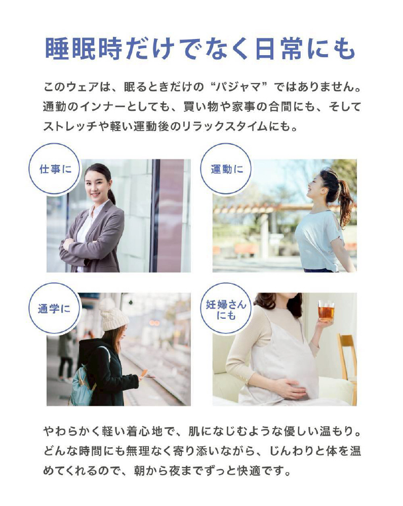熱伝導率が高く、医療やバイオ、美容健康にまで応用されるテラヘルツ鉱石を粉体にし、生地にプリントすることで血行を促進できる機能性のインナーです。