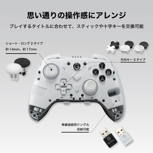 プレーヤーが気軽に操作感を変更し、新しいプレイスタイルへ切り替えられるカスタマイズパーツが付属。(ジョイスティック:ショート・ロング全2種、十字キー:全3種)また、ボタン操作のみで自分の選択したボタンを背面に配置することが可能です。ソフトウェア不要なため、PCやスマートフォンを持っていない方も自由にスタイルを変更できます。