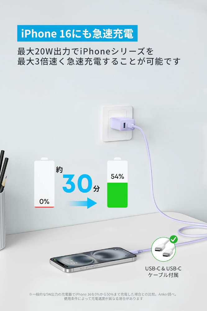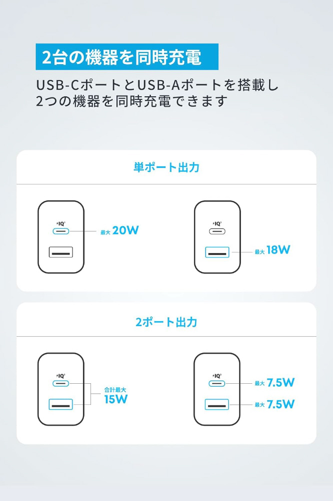 最大20W出力で、iPhoneを含むスマートフォンへの充電に最適です。
