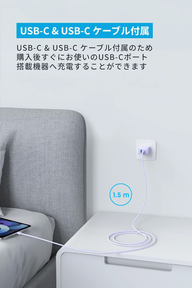 USB-C & USB-C ケーブル(1.5m)付属のため、すぐにお使いのiPadやUSB-C機器へ充電可能です。