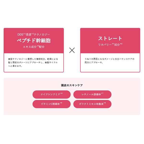※1ヒト毛根幹細胞順化培養液(保湿成分)、加水分解ケラチン(羊毛)(補修成分) ※2傷んだ髪の毛先まで補修してなめらかにすること ※3リシンHCl、アミノエチルチオコハク酸ジアンモニウム(保湿、補修成分)