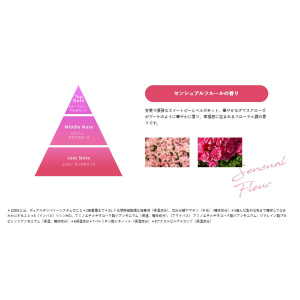 うねり、くせ毛を抑えながら頭皮のスキンケア、根元から毛先までまっすぐおさまる髪へ。センシュアルフルールの香り。