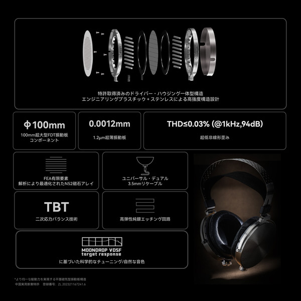 「楽園-PARA」シリーズは、従来の平面磁気ヘッドホンとは異なり、100mm の超大型振動板コンポーネントを採用しているだけでなく、シリーズ独自のFDT全面駆動技術を搭載しています。この革新的な技術により、振動板全体が磁場内に均一に配置され、その表面全体にわたって均等かつ効果的な駆動回路*が設計されています。これにより、従来の平面磁気型ヘッドホンの駆動精度を大きく上回り、静電型ヘッドホンに匹敵するほどの低分割振動特性を実現しました。