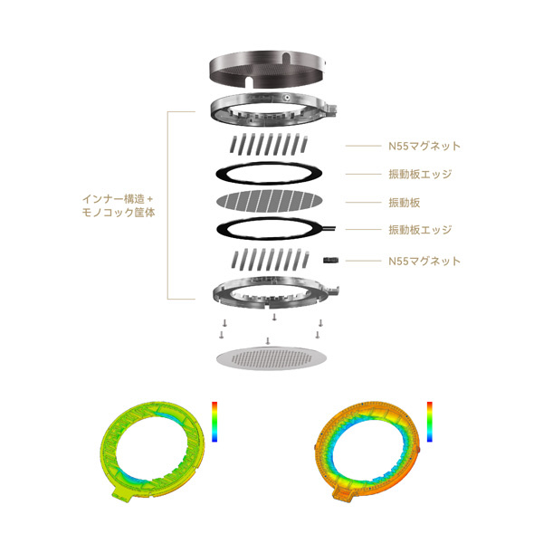 特別なサイズの N55 ネオジムマグネットを 36 個使用し、振動板の振動面全体を覆う平面駆動が形成されています。また、FEA 有限要素解析によって最適化され、振動板の振動面における磁界の均一かつ効率的な分布を確保します。