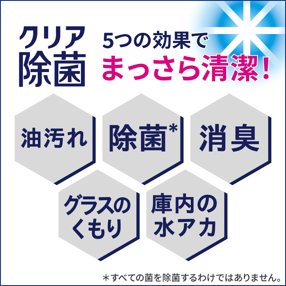 食器も庫内もまるごと一発洗浄!しつこい油汚れ・ニオイ・菌のエサまで落とし、つめこみ洗いでもすみずみ清潔。ご飯粒・卵などの落としにくい汚れ、グラスのくもり、庫内の水アカも落とします。まとめ洗いでも、食器が重なっていても、フライパンや鍋も、しっかり洗浄。除菌※・消臭も。ワンプッシュで1回分が出るボトルだから、片手でラクラク計量いらず。すっきりシトラスの香り。※すべての菌を除菌するわけではありません。