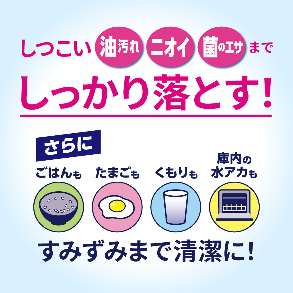 食器も庫内もまるごと一発洗浄!しつこい油汚れ・ニオイ・菌のエサまで落とし、つめこみ洗いでもすみずみ清潔。ご飯粒・卵などの落としにくい汚れ、グラスのくもり、庫内の水アカも落とします。まとめ洗いでも、食器が重なっていても、フライパンや鍋も、しっかり洗浄。除菌※・消臭も。ワンプッシュで1回分が出るボトルだから、片手でラクラク計量いらず。すっきりシトラスの香り。※すべての菌を除菌するわけではありません。