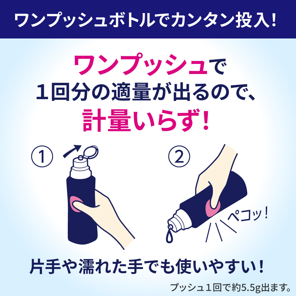 食器も庫内もまるごと一発洗浄!ワンプッシュで1回分が出るボトルだから、片手でラクラク計量いらず。