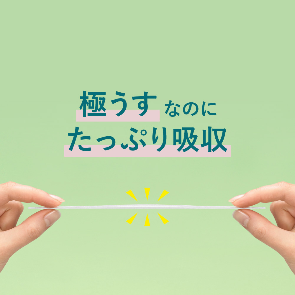 瞬間吸収のロリエ 極うすなのにたっぷり吸収 ベタつき ごわつき ムレなしへ 独自のストレスフリー設計●ふいに出てもすぐにさらさら●表面のなめらかさ15%アップ※ 快適なつけ心地●しなやかフィットでドキッとしたときも余裕●全面通気性シートでムレにくい●極うす&コンパクトで、持ち運びもストレスフリー ※当社従来品比(2021年2月時点)(医薬部外品)