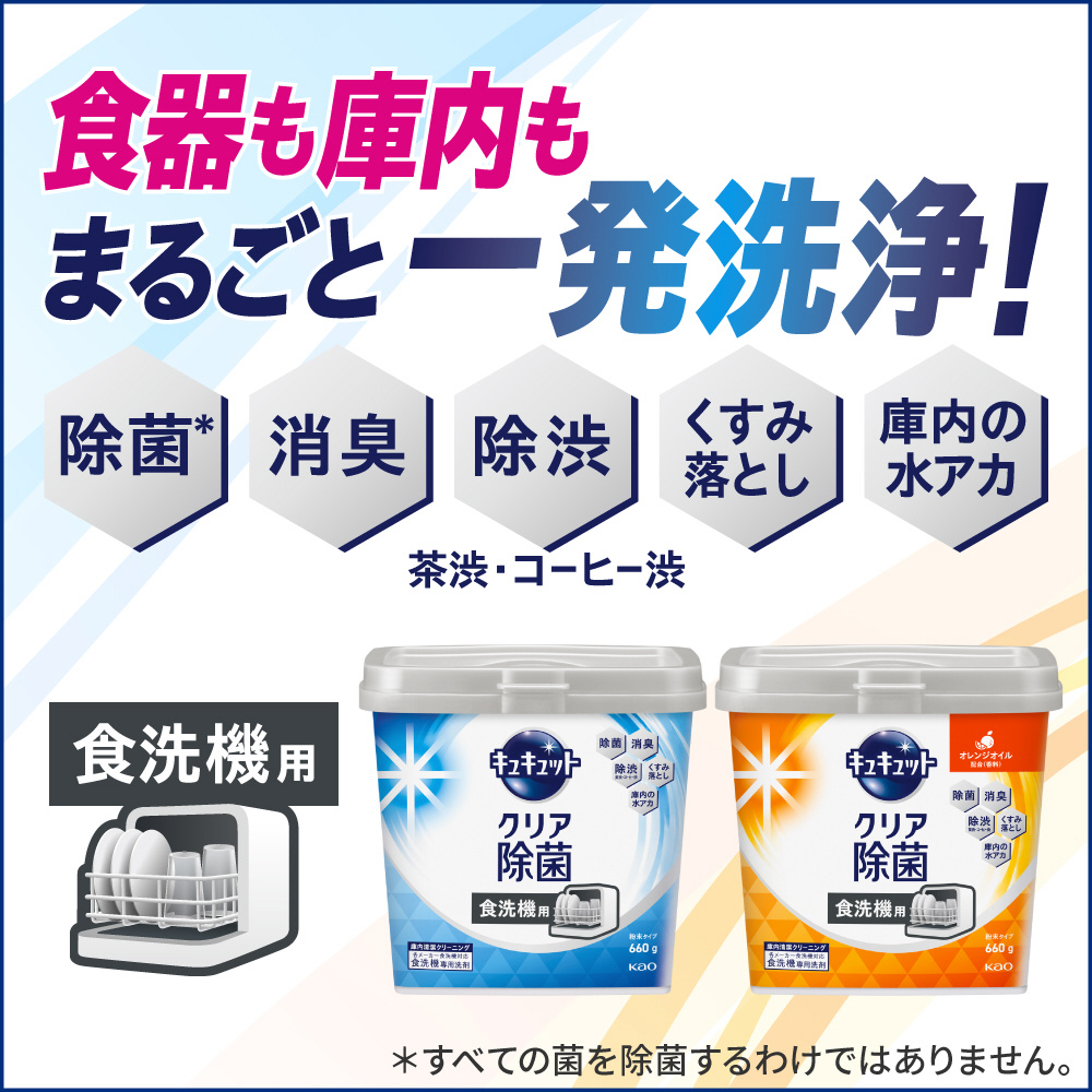 食器も庫内もまるごと一発洗浄!すみずみまで洗い上げ、油汚れもしっかり洗浄!ご飯粒・卵などのこびりつき汚れも強力分解し、洗うたび除菌※・スッキリ消臭!茶渋・コーヒー渋、くすみも落として、グラスや食器がクリアな仕上がりに。庫内の水アカ対策もできます。つめかえ用。オレンジオイル配合(香料)。※すべての菌を除菌するわけではありません。