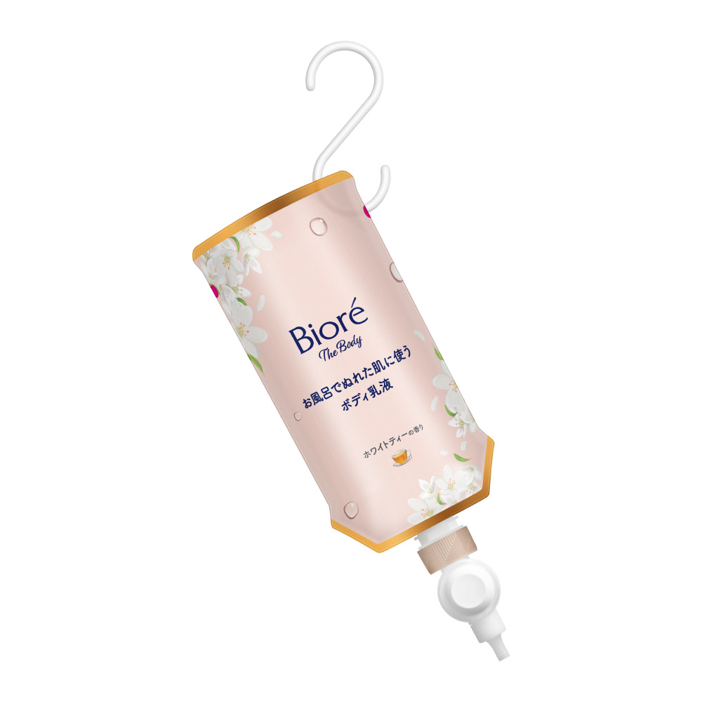 湯あがり後、乾燥始まる前にお風呂でうるおい密封!濃厚保湿、肌しっとりタイプ。ぬれた肌に使って、肌の角層まで浸透&密着。お風呂の中でつりさげて、立ったまま使えるつりさげパックは、置き場所をとらず、衛星的に、ムダなく使い切れる。軽い力でカンタン液量調整できる、らくらくスイッチ採用。○顔までしっとり保湿○弱酸性○素肌のバリア機能の働きを補い、肌を保護する○ホワイトティーの香り