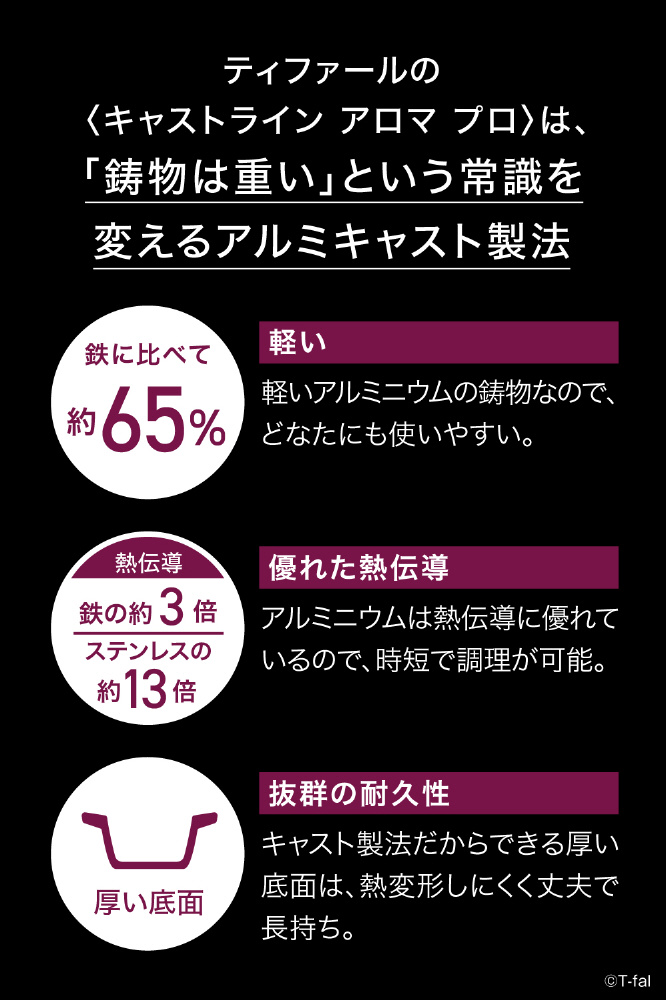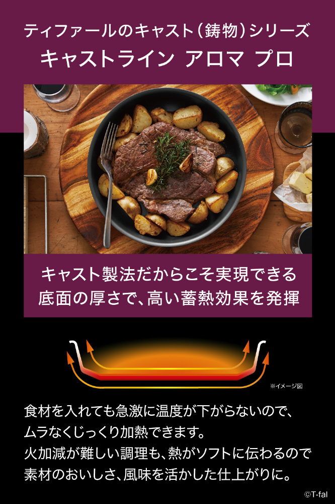 【すばやい熱伝導と優れた蓄熱性を兼ね備えたアルミキャスト製法】・アルミの持つ優れた熱伝導で、ムラなく全体を素早く加熱します。