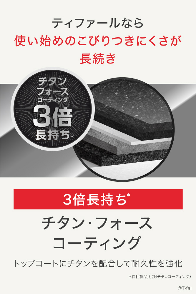 ・高い耐久性を実現した「チタン・フォース コーティング」で、使い始めのこびりつきにくさが長く続きます。