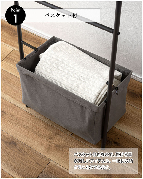 バスケットが付いているので、吊り下げ収納が難しいアイテムも収納可能。