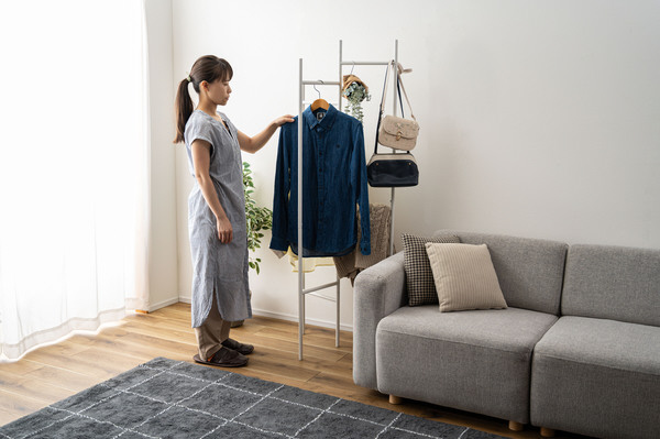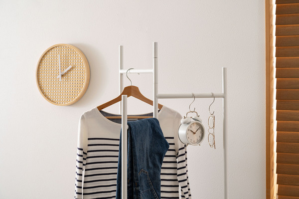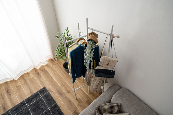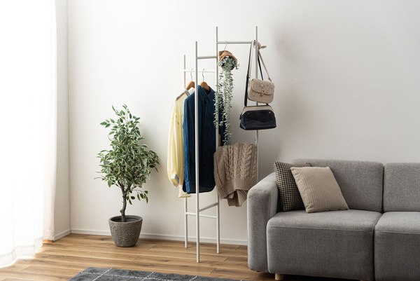 衣類やバッグを「魅せて収納」できるインテリア性の高さに加え、パタンと折りたためる便利な構造で、使わないときはスリムにしまえる設計です。
