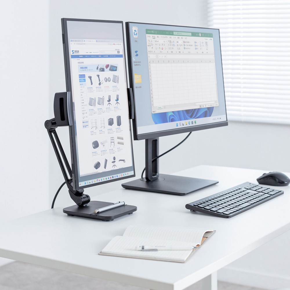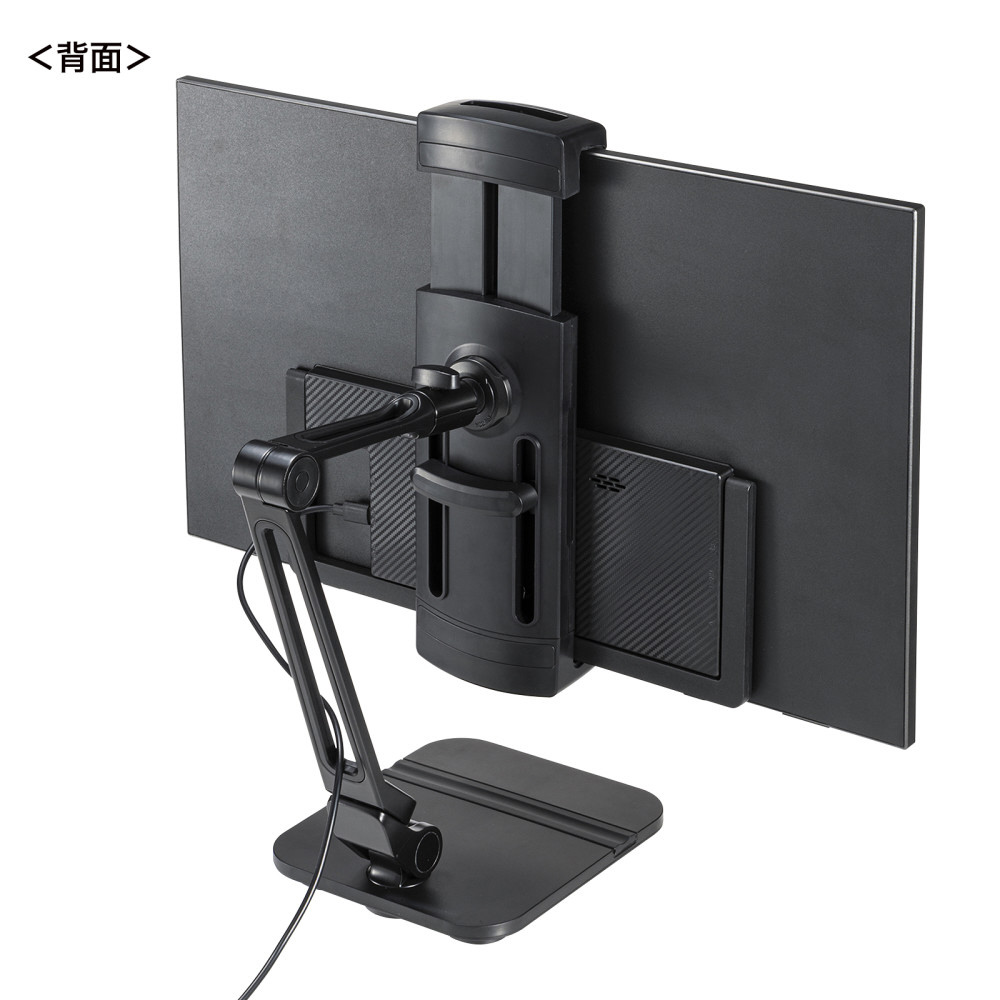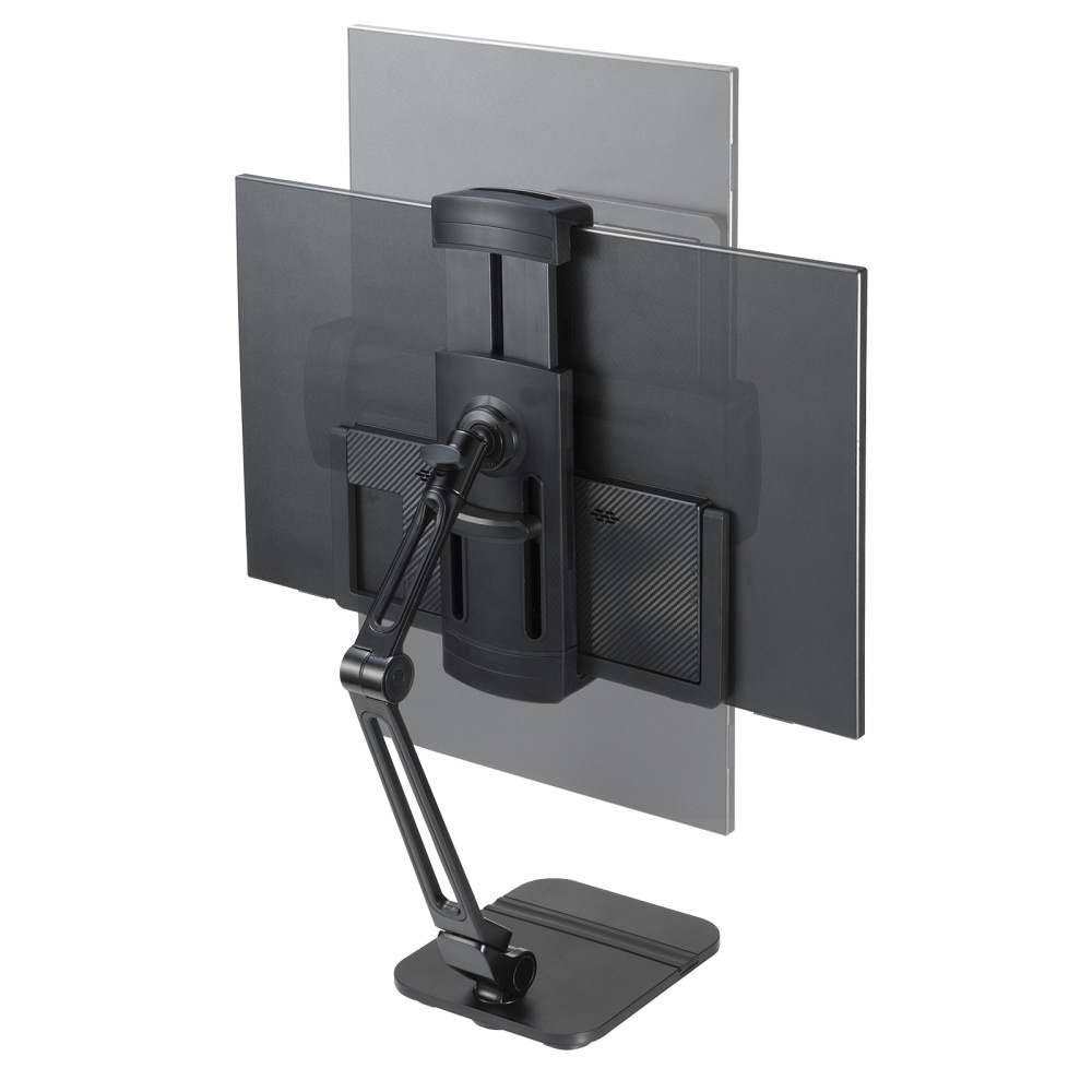モバイルモニター / タブレットPC対応 [〜17.3インチ、幅185〜270mm・厚さ〜16mm] アームスタンド 2関節アーム 前後上下位置調整 360度回転 無段階角度調節 PDA-STN84BK