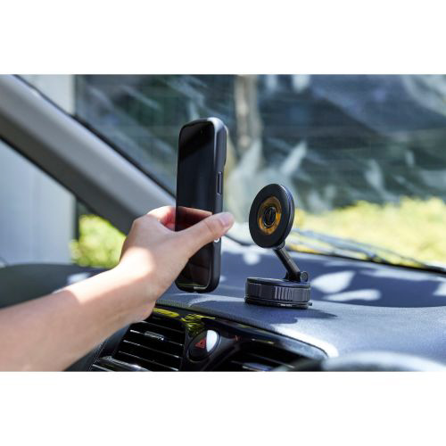 N52超強力ネオジム磁石を採用。MagSafe対応のスマートフォンやケースを使用することでホルダーに固定でき、運転中の振動や急ブレーキなどによるスマートフォンの落下を防ぎます。